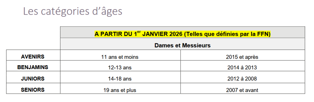 Catégories d’âges saison 2025/2026Avenirs : filles et garçons né(e)s en 2014/2015 Benjamin(e)s : filles et garçons né(e)s en 2012/2013 Juniors : filles et garçons né(e)s de 2008 à 2011 Seniors : filles et garçons né(e)s en 2007 et avant Masters : + de 25 ans